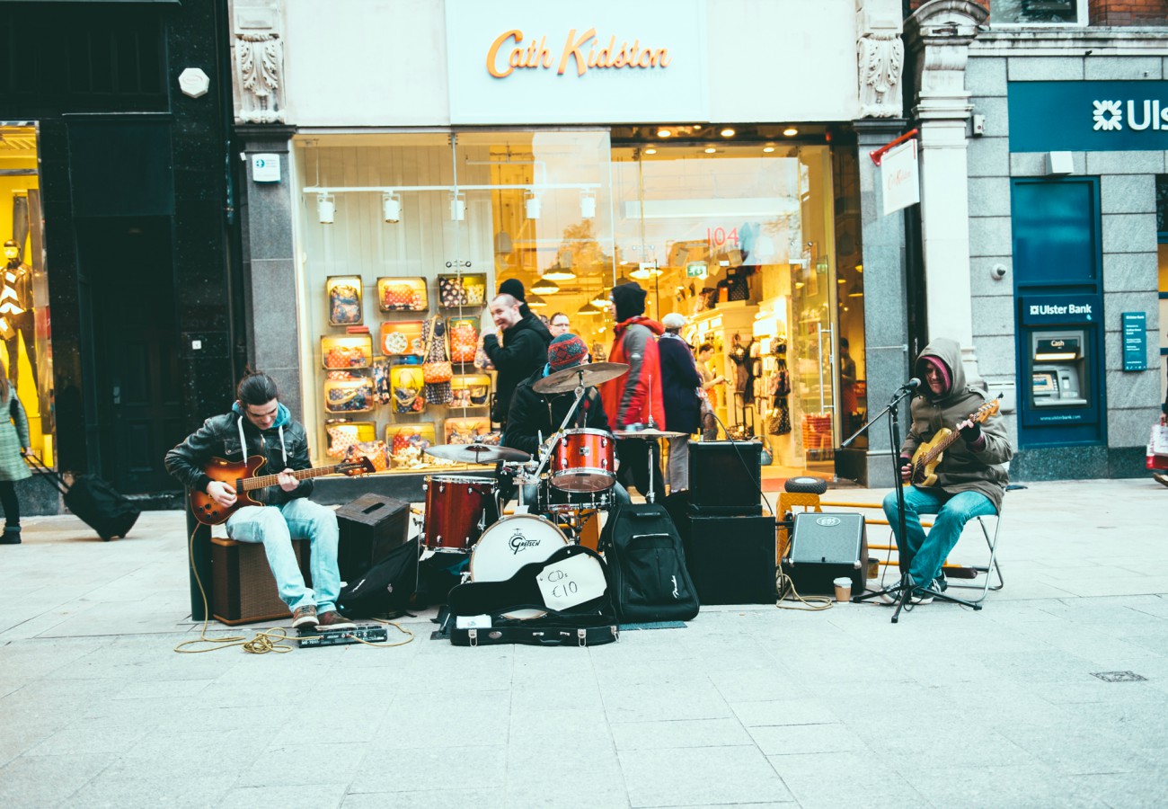 "Busking" é o termo em inglês usado para músicos que tocam na rua em troca de dinheiro, uma cena extremamente comum na Irlanda, principalmente em Dublin, com seu potencial turístico. A atividade é lev